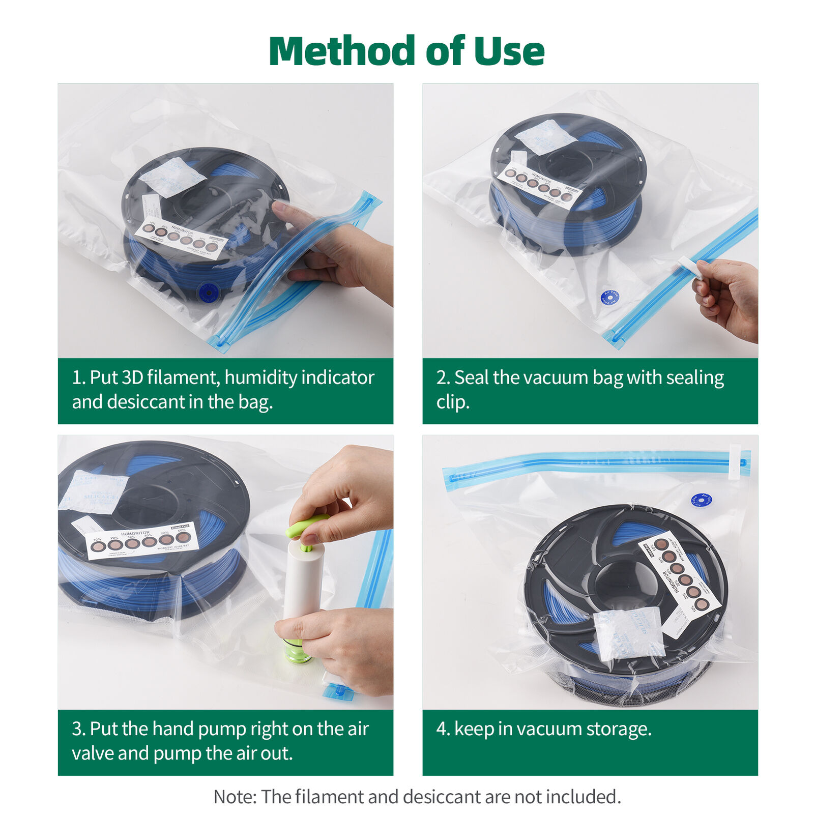 - Einfach zu bedienen: Legen Sie Ihr Filament einfach in einen Vakuum-Aufbewahrungsbeutel, verschließen Sie den Verschluss mit dem Verschlussclip, halten Sie die Auslassöffnung auf einer flachen Plattform und saugen Sie dann die Luft mit der Pumpe ab. (Wir empfehlen, vor dem manuellen Pumpen zuerst etwas Luft herauszudrücken, das erleichtert das Abpumpen und spart Zeit und Mühe.)